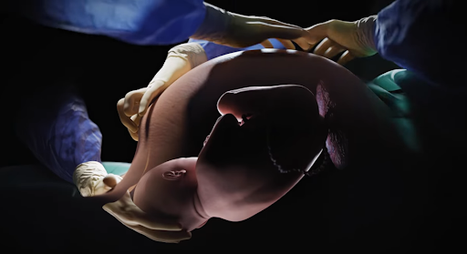 Um dos estágios do processo de parto por cesariana demonstrado em um vídeo dedicado no canal do YouTube da VOKA.)