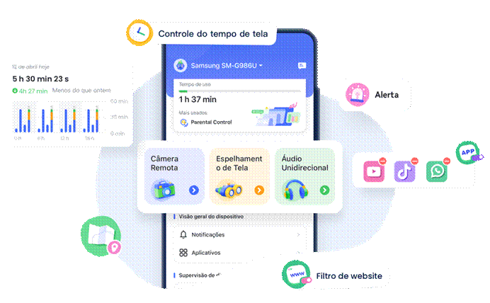 - Monitoramento de mensagens em apps como WhatsApp, Instagram e TikTok